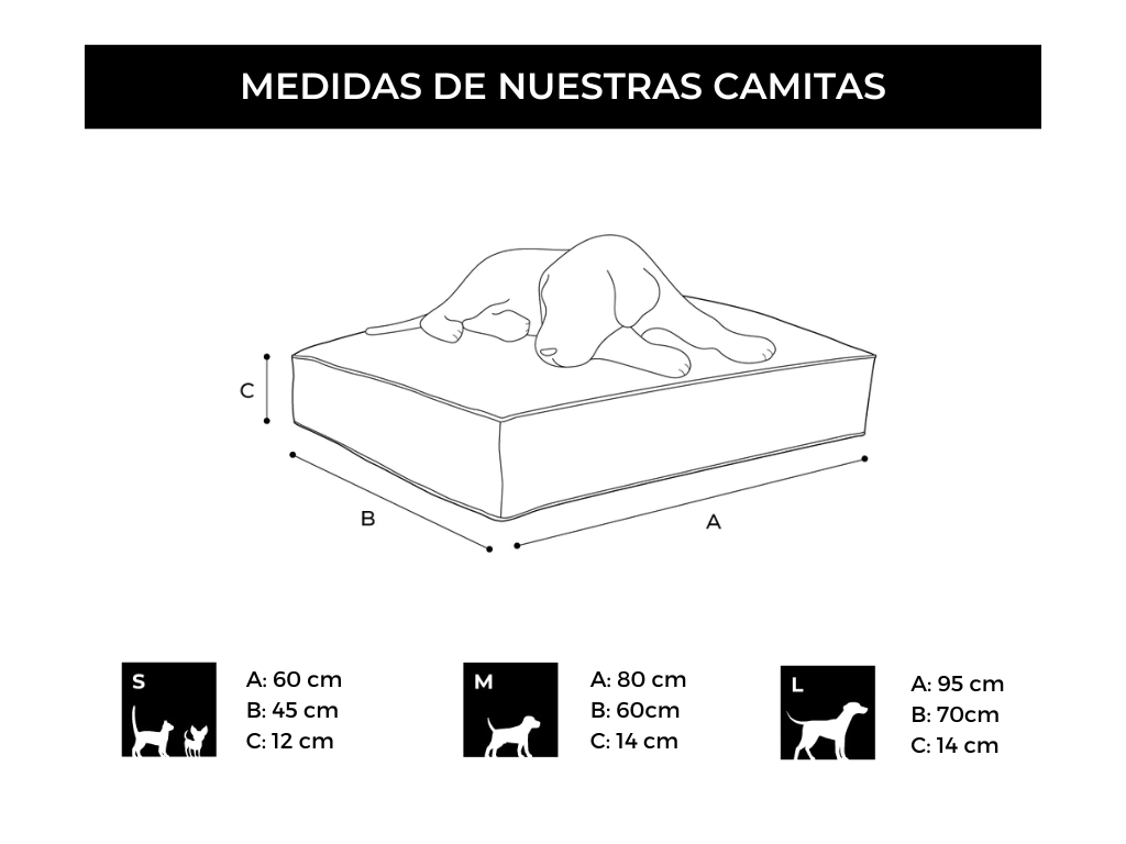 RELLENO: Su cómodo relleno de 14 cm de altura en los tamaños M y L, y 12 cm de altura para el tamaño S, están confeccionados con la fórmula perfecta y testeada de copos de goma espuma premium de alta densidad, se adapta al cuerpo de la mascota, le brinda gran confort y no se deforma con el uso ni el tiempo.